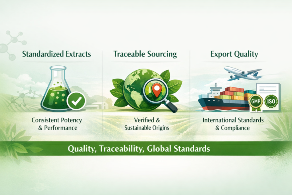 We manufacture scientifically standardized herbal extracts and natural actives with a strong focus on quality, consistency, and compliance. Our ingredients are designed to support nutraceutical, dietary supplement, and functional food applications worldwide.